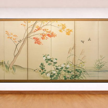 Byōbu (屏風), bogstaveligt talt “vindbeskyttelsesskærme,” er traditionelle japanske foldeskærme, der oprindeligt blev lavet til at opdele rum og i dag primært værdsættes som iøjnefaldende vægkunst.