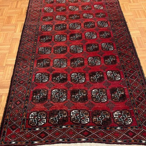 Afghan, Buchara, Håndknyttet traditionelt unikt turkmensk tæppe i rødt naturu...