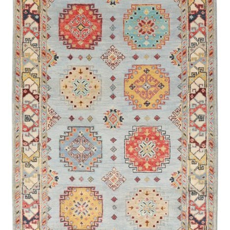 Kazak-tæpper fra Pakistan er håndknyttede tæpper, der oprindeligt blev inspireret af de nomadiske stammer i Kaukasus. De kendetegnes ved deres kraftige farver, geometriske mønstre og traditionelle symbolik. Typiske farver er rød, blå og beige, som opnås med plantebaserede farvestoffer. Tæpperne er fremstillet af høj kvalitet ny uld, hvilket giver dem en robust og holdbar struktur. Kazak-tæpper er populære både på grund af deres æstetiske skønhed og deres holdbarhed.