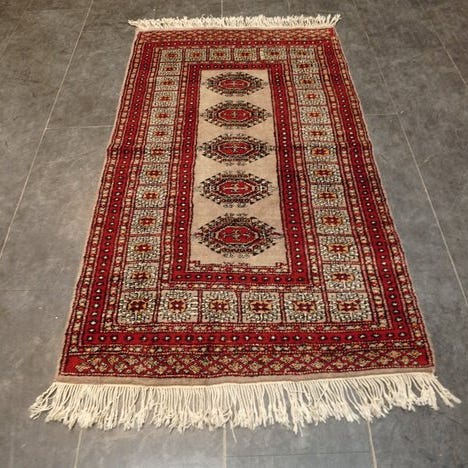 Håndvævet Buchara-tæppe fra Pakistan i godt stand, ca. 157 × 96 cm, uld på bomuld, produceret i slutningen af det 20. århundrede. Klik på den blå "gå til varen" knap, for at købe eller byde på denne vare. Den samlede pris vil blive vist inden du afgiver dit bud.