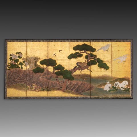 Et storslået højt seks-panel byôbu 屏風 (foldeskærm), der skildrer en forsamling af kranier 鶴 (tsuru) blandt unge fyrretræer 松 (matsu).