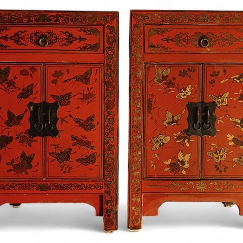 To trægenstande i antik kinesisk stil, dateret 1940–1950, brune, mål 60 cm højde, 40 cm bredde og 40 cm dybde, i diskret tilstand med brugsspor. Klik på den blå "gå til varen" knap, for at købe eller byde på denne vare. Den samlede pris vil blive vist inden du afgiver dit bud.