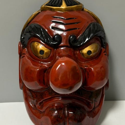 Edo-periodens lille træmaske inspireret af Gigaku, håndhugget i Japan, ca. 9,2 cm høj, 7,4 cm bred, 5,5 cm dyb, ca. 20 g, i dårlig stand med revner og skader. Klik på den blå "gå til varen" knap, for at købe eller byde på denne vare. Den samlede pris vil blive vist inden du afgiver dit bud.