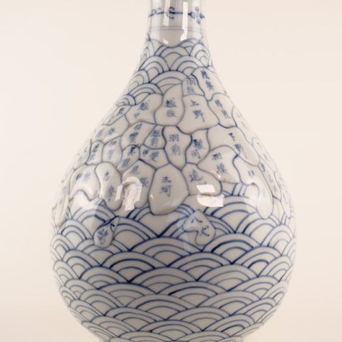 Langstrakt form med tydelig hals. Dragemotivet på mørk blå baggrund.