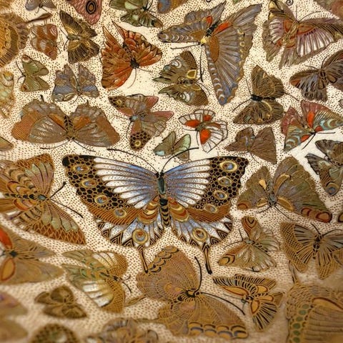 Vasen udstråler Kaga zogan’s karakteristiske elegance — den berømte flade inlay-teknik udviklet i Kaga-regionen — udført her med farvet metal-inlay (irogane) indlevet flush i bronzeoverfladen for at skildre svømmende øreblomstre (ayu, søøstersøer) med bemærkelsesværdig naturalisme og délicatesse.