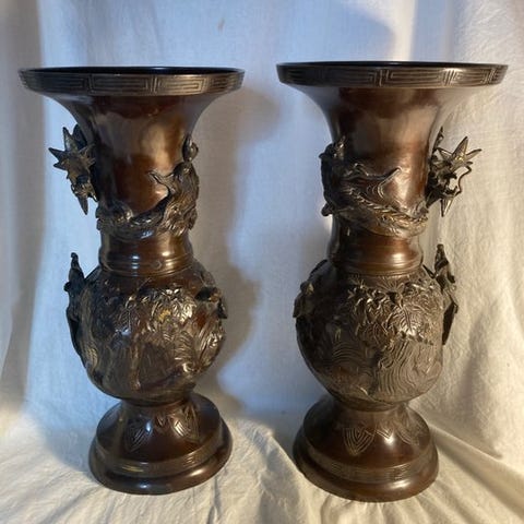 En bronzevase fra Meiji-perioden af Mizuno Genroku VIII (1838–1895) med Kaga zogan irogan-inlægning, der forestiller svømmede ayu, 18 cm høj og 7,5 cm bred, i god stand og med originalt træopbevaringsboks. Klik på den blå "gå til varen" knap, for at købe eller byde på denne vare. Den samlede pris vil blive vist inden du afgiver dit bud.