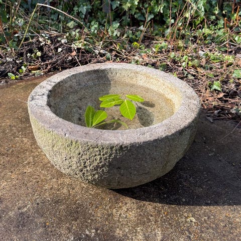 Skålen er udformet til at være delvist indlejret for en stabil placering i en haveindstilling.