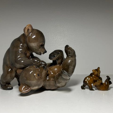 En enkelt porcelænsfigur af en setter i realistisk stil, brun, lavet i Tyskland, ca. 1950–1960, 17 cm høj, 10 cm dyb og 5 cm bred, i god brugt stand med mindre aldersrelaterede mærker. Klik på den blå "gå til varen" knap, for at købe eller byde på denne vare. Den samlede pris vil blive vist inden du afgiver dit bud.
