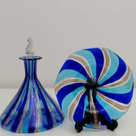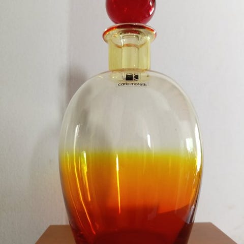 En signeret La Murrina Murano-glashalsk flaske fra 1970'erne, 21 cm høj og 10,5 cm i diameter, i fremragende stand, med aftagelig låg der gør den til en vase. Klik på den blå "gå til varen" knap, for at købe eller byde på denne vare. Den samlede pris vil blive vist inden du afgiver dit bud.
