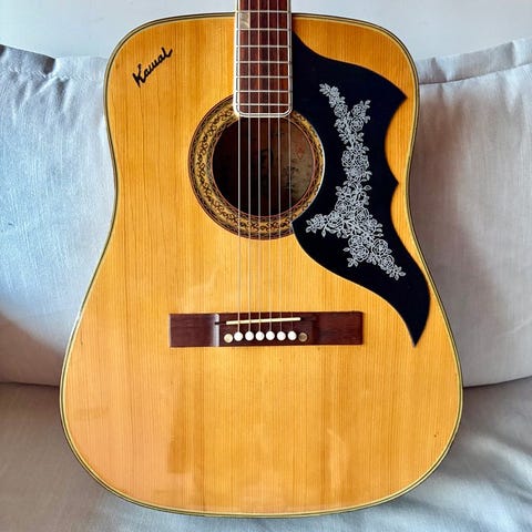 Austrotysk fabriksguitar fra omkring 1900 med top i grantræ, ryg og sider i birk, hals i ahorn (lakkeret sort) og messingsmekker, vægt 1080 g, i rimelig stand for sin alder og testet og funktionel. Klik på den blå "gå til varen" knap, for at købe eller byde på denne vare. Den samlede pris vil blive vist inden du afgiver dit bud.