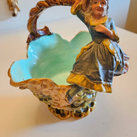 Grøn uranglas-kurv, vaselinaglas, håndblæst med forhøjet hank og subtile støbte dekorationer, cirka 1970–1980 ifølge detaljer, 13 cm høj, 12 cm bred, 5 cm dyb, fluorescerer under UV-lys, i god stand med fine sprækker ved håndtagsfastgørelserne. Klik på den blå "gå til varen" knap, for at købe eller byde på denne vare. Den samlede pris vil blive vist inden du afgiver dit bud.