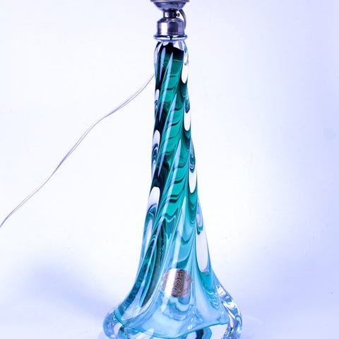 Stykke uden signatur i massen men med genkendelig original etikette (formodentlig Val Saint Lambert, beskadiget/ulæselig men typisk for mærket), massiv organisk asymmetrisk V-form med udstrakte spidse arme og central hul, vævet vejr- og iris-effekt typisk for René Delvennes 1960'erne kreationer i serien « Fantaisies modernes »: generøse volumener, abstrakt-naturlig inspiration, dybe nuancer og optiske effekter).