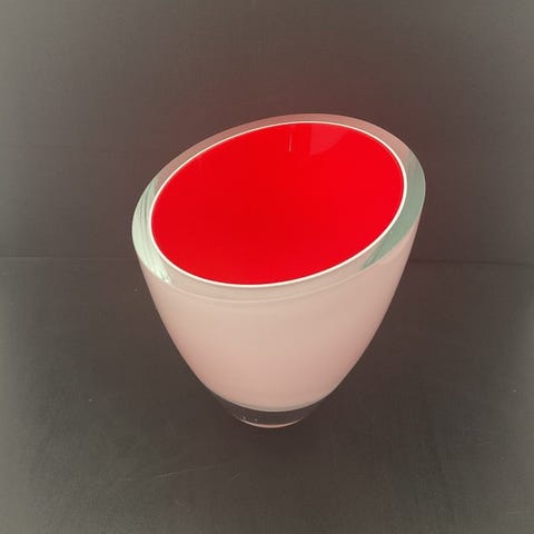 Vasen kendetegnes ved et elegant, moderne design med en skråt skåret hals. Glasset er udført i en stilfuld kombination af opalhvid på ydersiden og en levende havgrøn/turkis inderside. På grund af den tykke glasfod står vasen meget stabilt.