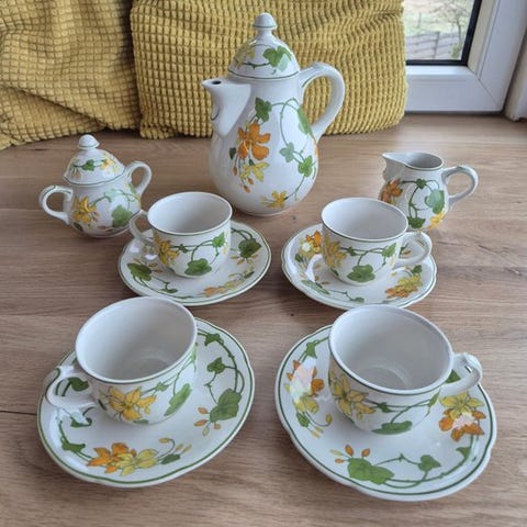 Villeroy & Boch Wildrose kaffesæt, 12 dele, håndmalet, 1. kvalitet, produceret i Vesttyskland i 1970–1980, inklusive kande med låg, varmer, mælkekande, sukkerkrukke med låg, fire kaffekopper og fire underskåler, fremragende stand med minimale brugsspor. Klik på den blå "gå til varen" knap, for at købe eller byde på denne vare. Den samlede pris vil blive vist inden du afgiver dit bud.