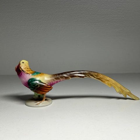 Herend andeduos porcelænsfigur i flerfarvet glasur (grøn, blå, pink, guld, hvid og turkis) fra Ungarn af Herend, med fiskenet-mønster og forgyldte detaljer, dateret 2000–2010, i nær ny stand. Klik på den blå "gå til varen" knap, for at købe eller byde på denne vare. Den samlede pris vil blive vist inden du afgiver dit bud.