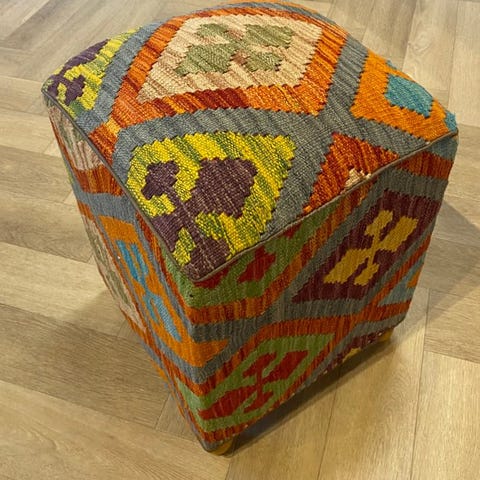 Denne autentiske puf/stol/sofa er lavet af 100% håndvævet Kelim, og benene er af træ. Meget ideel til din stue, soveværelse eller køkken. (Kelim er håndvævede tæpper af uld og bomuld)