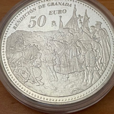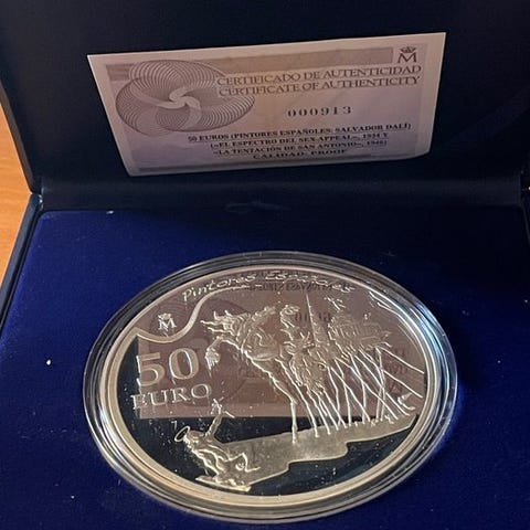 50 euro sølvmønt fra Spanien, 168,75 g, 2010 Goya Garrochista y El Aquelarre, proof i nytilstand. Klik på den blå "gå til varen" knap, for at købe eller byde på denne vare. Den samlede pris vil blive vist inden du afgiver dit bud.