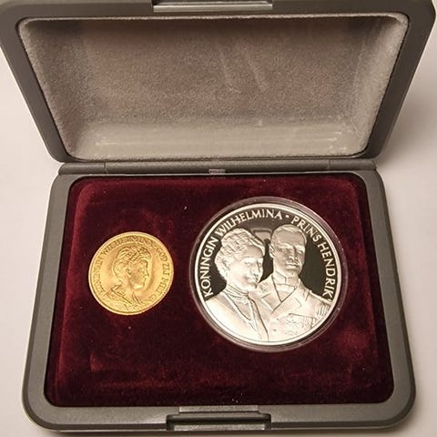 Guldmønter i 10 gulden fra 1897 med dronning Wilhelmina, anbragt i en guldbroche, vægt 6,72 g, diameter ca. 22,5 mm, 900/1000 guld, ikke certificeret. Klik på den blå "gå til varen" knap, for at købe eller byde på denne vare. Den samlede pris vil blive vist inden du afgiver dit bud.