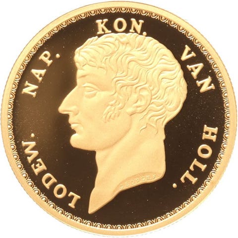 Guldpenning baseret på det oprindelige 10 gulden-stykke fra 1808, udstedt under kong Ludvig Napoleon, den første konge af Holland.
