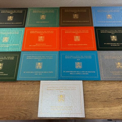 Vatikanstaten euro årssæt i Brilliant Uncirculated-stand fra 2002 til 2024, 29 originale mapper med læderlignende omslag (32×26 cm), inklusiv særlige 9-mønt-udgaver for 2018 og 2024 og dobbelte udgaver for 2005 (normal + Sede Vacante), i alt 29 sæt. Klik på den blå "gå til varen" knap, for at købe eller byde på denne vare. Den samlede pris vil blive vist inden du afgiver dit bud.