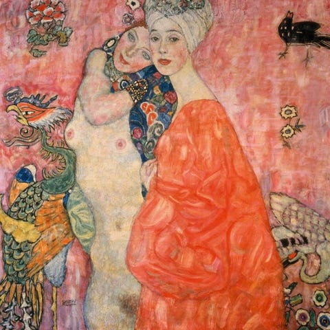 Det er et af Klimts berømte kvinderportretter, der er kendt for deres dekorative stil.