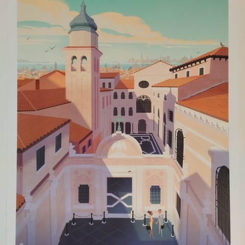Billedet skildrer to mandlige skikkelser i baglys, nedsunkne i et stort blåt fæld, der gradvist opløses til lysere nuancer. Silhuetterne, enkle og poetiske, skaber kontrast mellem skygge og lys, typisk for Folons drømmende sprog. Kompositionen antyder stilhed, selvransagelse og en følelse af venten, hængende, forstærket af det delikate og sparsomme farvevalg. Et værk, der fuldt ud indkapsler den surrealistiske og meditativt atmosfære hos den belgiske kunstner.