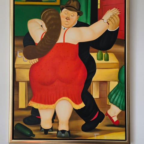 Med sin karakteristiske stil forvandler Fernando Botero en enkel dansecene til en eksplosjon af vitalitet og ironi. Protagonisternes generøse former, indhyllet i en intim og svævende atmosfære, legemliggør kærligheden til livet og evnen til at fange poesien i hverdagen.