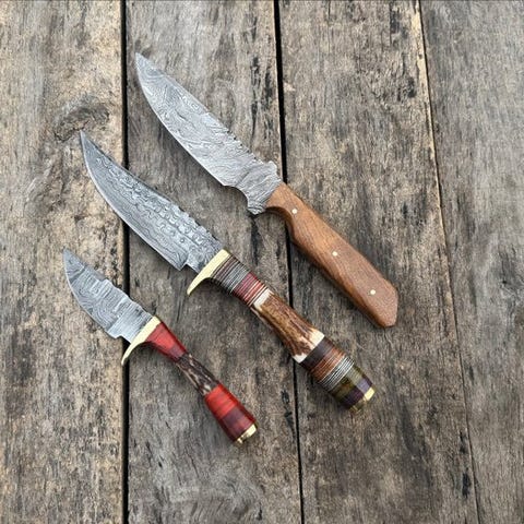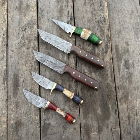 Smukt matchende sæt af fem håndlavede køkkenknive, fremstillet af mønstret Damascus-stål. Hvert blad viser et attraktivt lagdelt stål mønster, resultatet af traditionelle smedeteknikker. Sættet dækker et bredt udvalg af køkkenopgaver, fra tung hakning til fin skæring.