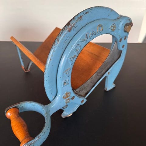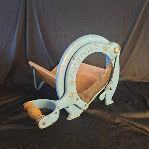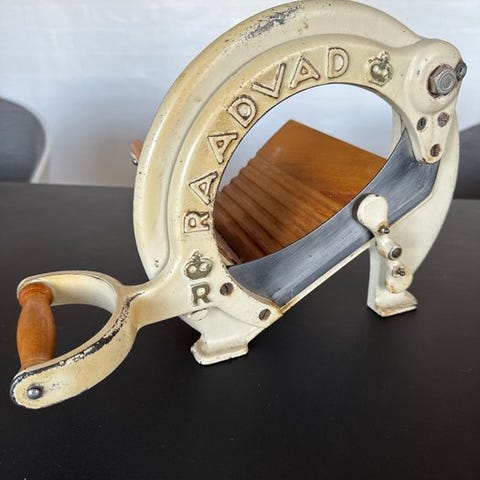 Brødskæremaskinen er fuldt funktionsdygtig til at skære brød og samtidig meget dekorativ.