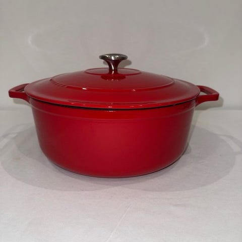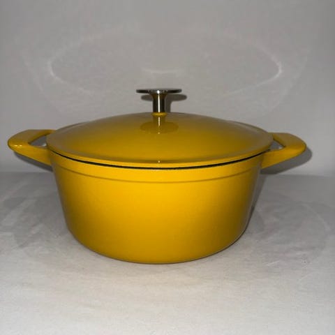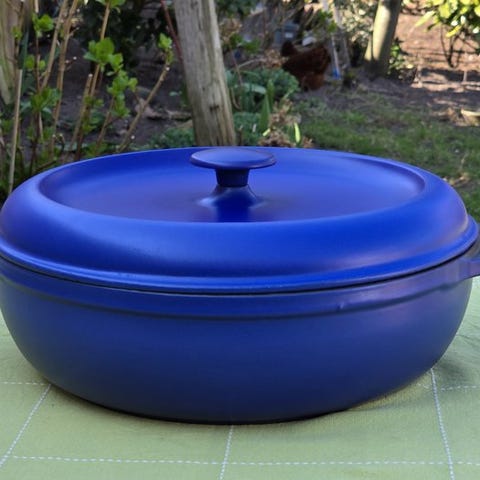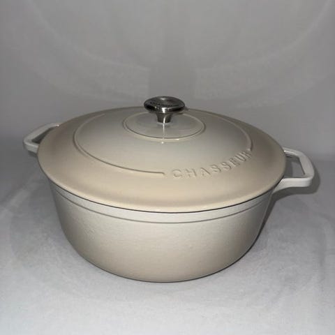 Strålende støbejernsgryde i rund form, emaljeret i blå farve, egnet til alle varmekilder herunder induktion, fra det berømte franske mærke Chasseur, nuværende markedspris 349€, ny i god stand (se billeder)
