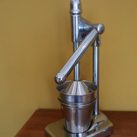 Særdeles flot og tung udgave af en vintage professionel håndbetjent citruspresser. Citruspresseren har et Space Age-design og fungerer fremragende. Derudover er den også fuldt funktionel med en løftefunktion. Der kræves derfor kun lidt kraft for at opnå maksimalt udbytte, en presse der virker mere effektiv end en almindelig eller elektrisk citruspresser. Der er ingen elektricitet nødvendig, og pressen er kompakt og optager derfor lidt plads på køkkenbordet og kan nemt opbevares.