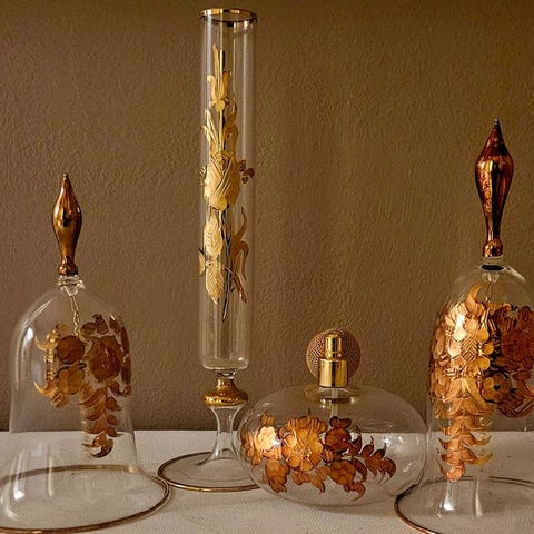 Smukke krystalglas, yderst sjældne, kendetegnet ved udsmykkede forgyldte detaljer, ædelt glas, zecchino-guld.