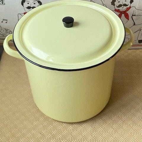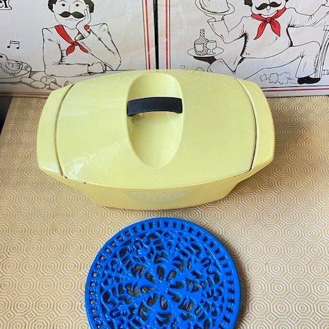 Vintage gryde med låg og brochure på fransk. Både gryden og brochuren er brugt (se billederne).