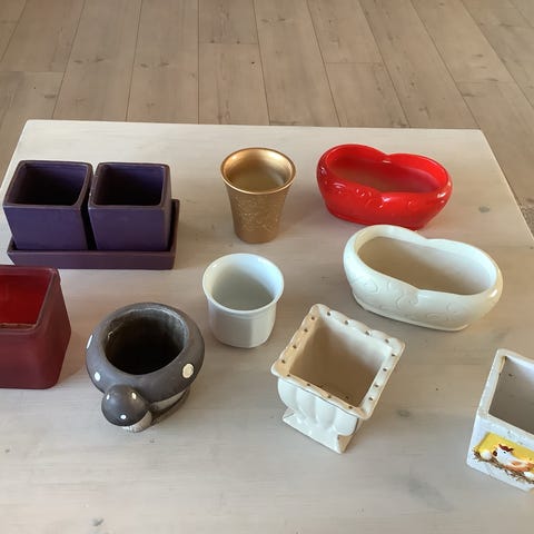 11 firkantede urtepotter i keramik med krakelé-mønster i hvidlig nuance. Potterne har en konisk form, der er bredere foroven og står på en firkantet fod. Velegnet til mindre planter, krydderurter eller som dekorative beholdere i hjemmet. Kan bruges enkeltvis eller flere sammen på bord, vindueskarm eller hylde.
