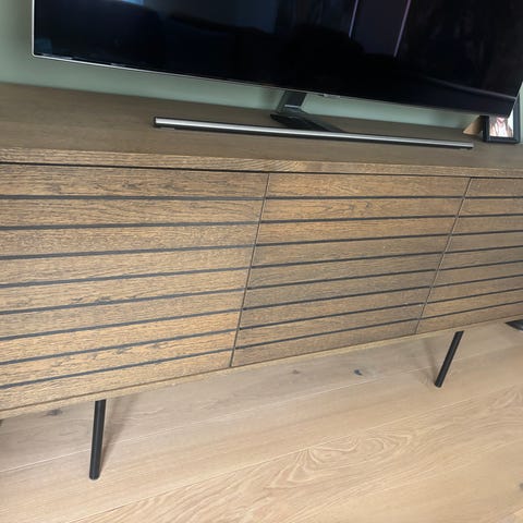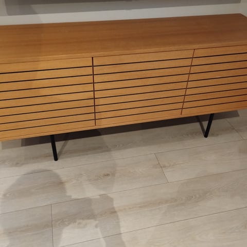 Skænk i matlakeret egefinér med 2 låger. Lågerne har push-funktion. Ben i sort pulverlakeret metal. Maxbelastning 15 kg pr. hylde.