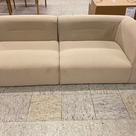 Grå model med sort-lakerede egetræsben. Hjørne modul på 90x90 og lige modul på 130x90. Kan fint vendes rundt da de ikke er skruet sammen. Hynden i det lange modul er en smule skrå i den ene ende da den har været en del af et større hjørne-setup. Sofaen er ikke ny, men er renset af prof og fremstår pæn.