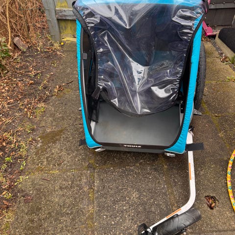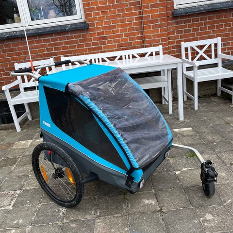 Thule cykeltrailer, fremstår stort set som ny. Brugt få gange. Traileren har plads til to børn med individuelle seler og polstrede siddepladser. Foran er der gennemsigtigt vindue, som beskytter mod vind og vejr, og siderne har netpaneler for ventilation. Bagpå er der opbevaringsplads til bagage.