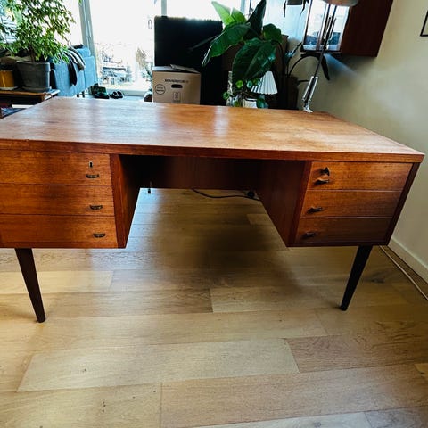 Super fint skrivebord i teak, med 3 skuffer med messinggreb fra 50’erne.