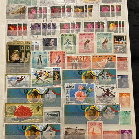 Frimærkesamling i rammer med flere forskellige motiver og farver. Samlingen består af flere indrammede tavler med frimærker, som kan bruges til dekoration eller til en samler, der ønsker et overblik over forskellige frimærketyper. Hver ramme indeholder et organiseret udvalg af frimærker, arrangeret efter mønster eller tema.