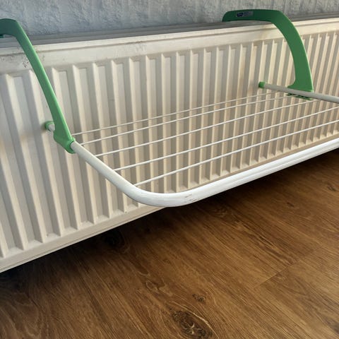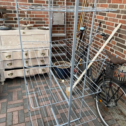 Tørresystem til ophængning på væggen med skinner. Fem moduler med syv snore på hver B 60 x D 40 cm. To hylder B 40 x D 18 cm.