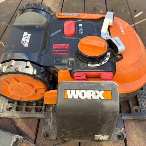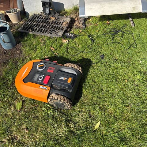 Worx Landroid robotplæneklipper i orange og sort. Enheden er beregnet til automatisk klipning af græsplæner og kører selvstændigt inden for et afgrænset område via afgrænsningskabel. Der medfølger ladestation, pløkker, kabel og ekstra knivblade.
