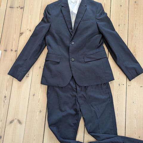 Flot jakkesæt fra H&M i størrelse 110. Brugt en gang til et bryllup og fremstår derfor som nyt. Blev væsket en gang og mangler kun lidt strygning. ;-) Sættet indeholder jakkesæt, hvid skjorte og blå butterfly.