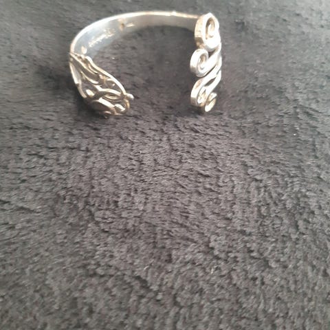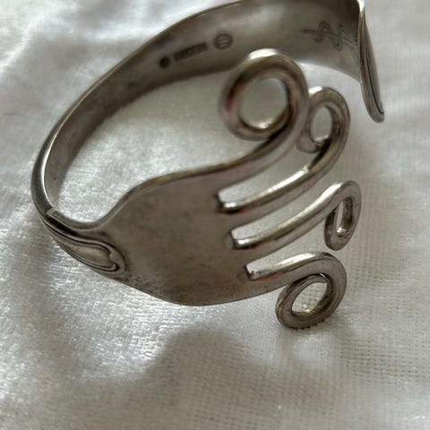 Et helt unikt armbånd lavet af to gafler, tre tårnet sølv. Jeg kender ikke navnet på bestikket, men specielt da det er en gaffel med fire tænder samt en ske. Vægt 38,40 gram
