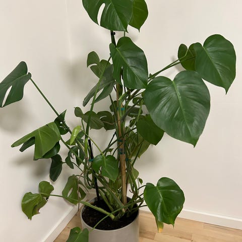 Monstera deliciosa stueplante uden potten. Den har det fint med små spor af flytning, så den kunne nok godt trænge til en god ompotning og et lille klip hist og her, men ellers en skøn plante der har vokset sig i hvert fald tre gange sin størrelse de sidste fem år :-) kunne den nok også i sit nye hjem🤞🏻