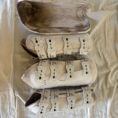 Forskellen på bagben og forben er udelukkende størrelsen, og de kan derfor fint bruges til forben på en mellemstor hest. Sælges udelukkende fordi jeg ved en fejl har købt to sæt til bagben, og de var for store til forben på min store pony.