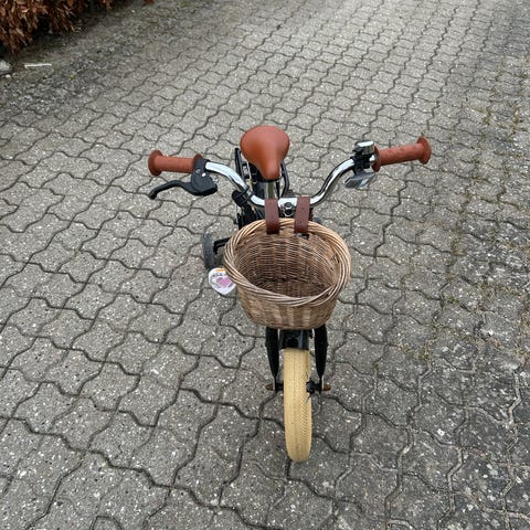 Børnecykel 12" med støttehjul i gul farve. Cyklen har små, brede dæk, kædeskærm, saddel og styr med håndtag. Velegnet til mindre børn, der skal lære at cykle ved hjælp af støttehjulene. Hjulstørrelsen er 12 tommer, hvilket typisk passer til de mindste begyndercyklister.