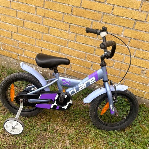 Ultimate børnecykel med 14" hjul. Cyklen er i blå farve med røde fælge og sorte dæk. Den har kædeskærm, støttehjul og håndbremse foran. Sædet er polstret og justerbart i højden, så cyklen kan tilpasses barnets størrelse. Velegnet som første eller tidlig læringscykel til mindre børn.