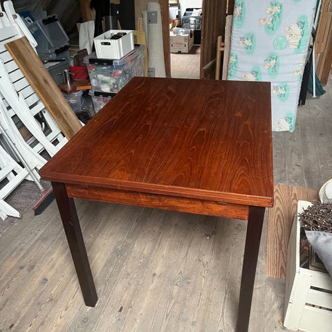 Ældre solidt teaktræsbord med udtræk. Synlige få skjolder men ellers velholdt.