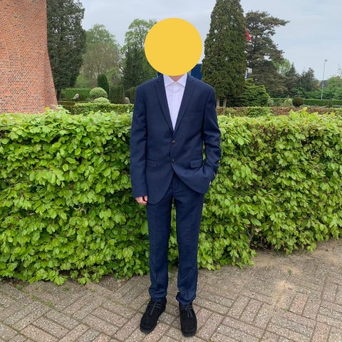 Jack & Jones jakkesæt til herre i str. 48. Sættet består af jakke og bukser i blå polyester. Klassisk pasform med foret jakke og matchende bukser. Købt til min egen konfirmation for 3 år siden, kun brugt cirka 4-5 gange.