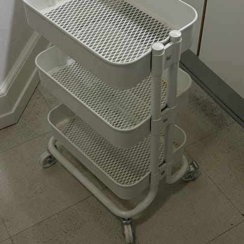 Rullebord med skab og åbne hylder. Bordet har en lys bordplade, et lukket skab i den ene side og åbne hylder i den anden side. Bordet står på hjul, så det er nemt at flytte rundt. Egnet som arbejdsbord, opbevaringsbord eller serveringsbord i fx køkken, bryggers eller værksted.